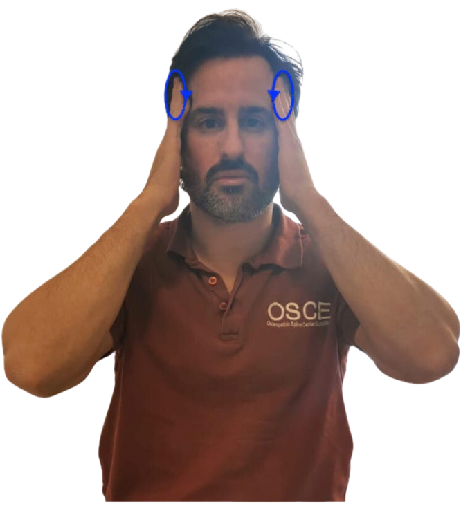 Appoggiare le dita di entrambe le mani semi-distese sulle tempie, applicare una pressione moderata (non troppo leggera, altrimenti si stimola solo la cute) ed esercitare dei piccoli movimenti lenti e circolari di frizione fino ad avvertire una sensazione di diminuzione della tensione e/o del dolore eventualmente evocato.